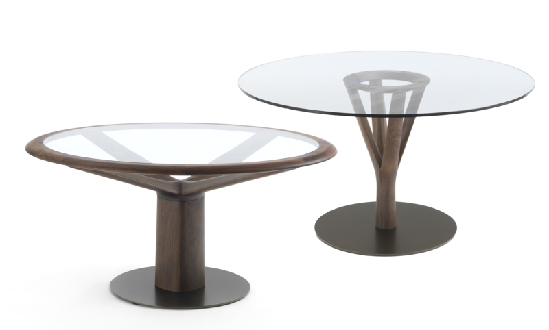 These coffee tables and pedestal tables combine a circular top and a curved wooden base on a round marble base. The skilfully balanced top echoes the vocabulary of marquetry and the graphic variety of precious wood species. The orientation of the wood grain creates a sense of surprise, a change of direction, a sense of movement.