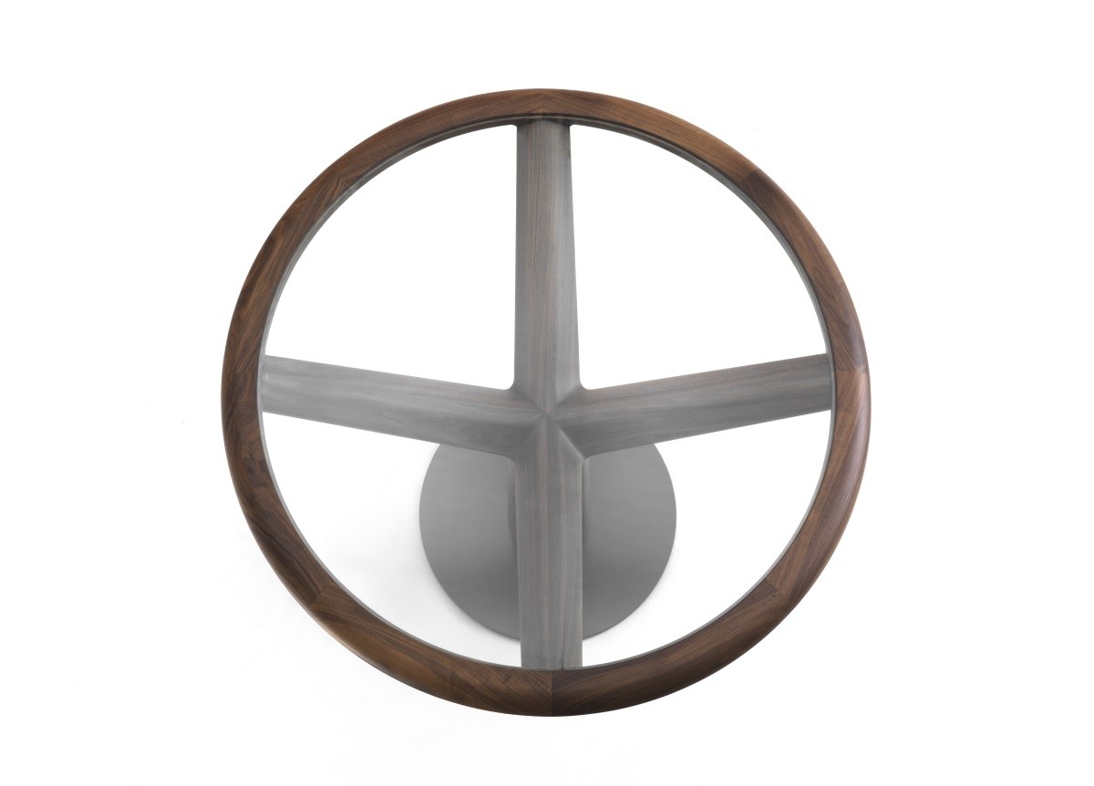 La version avec plateau en verre trempé, permet d’apprécier l’expertise de Porada dans le travail et l’usinage 5 axes du bois. La table Timber dining se décline en deux diamètres de grande taille. Les branches du piètement se prolongent dans la ceinture du plateau. Ce cerclage permet d’accueillir un plateau en verre ou en pierre.