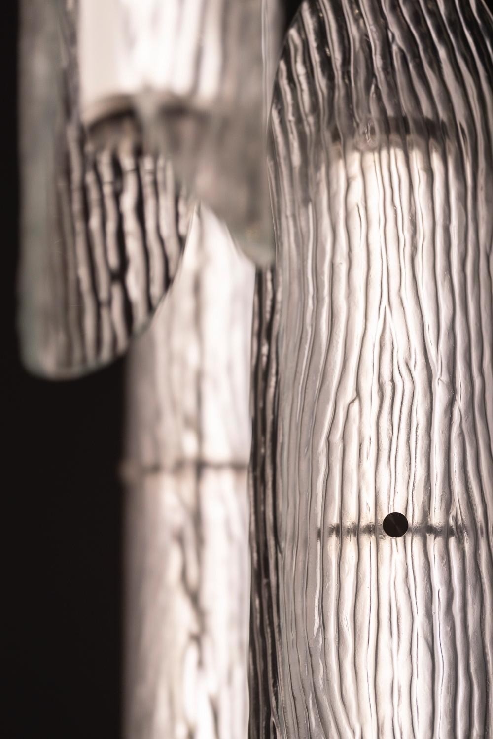 Ce processus a donné naissance à un jeu de lumière d’une richesse inédite, sublimé par la densité du verre, bien plus nuancée qu’avec un procédé industriel. En contrepoint, un fin tube de borosilicate abrite la technologie, tandis que la pièce en verre soufflé flotte au-dessus. L’équilibre entre ces deux matériaux – l’un brut et massif, l’autre aérien et précis – confère à l’ensemble une présence sculpturale saisissante.